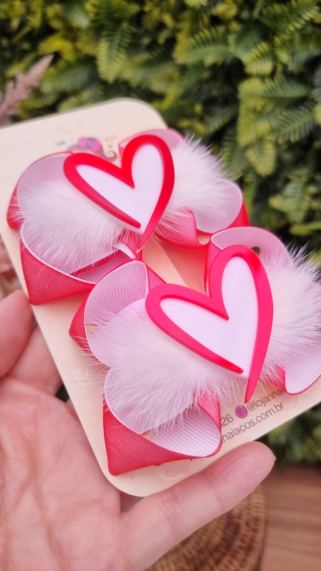 Feito tudo a mão, utilizamos diversos materiais nesse lacinho, tendo uma fita na cor vermelha dando aquele charme, a outra fita utilizamos a cor branca dando volume para o laço ficando nesse formato arredondado que super amamos. Estes lacinhos acompanham um aplique que é um coração em duas cores. Branco e vermelho!