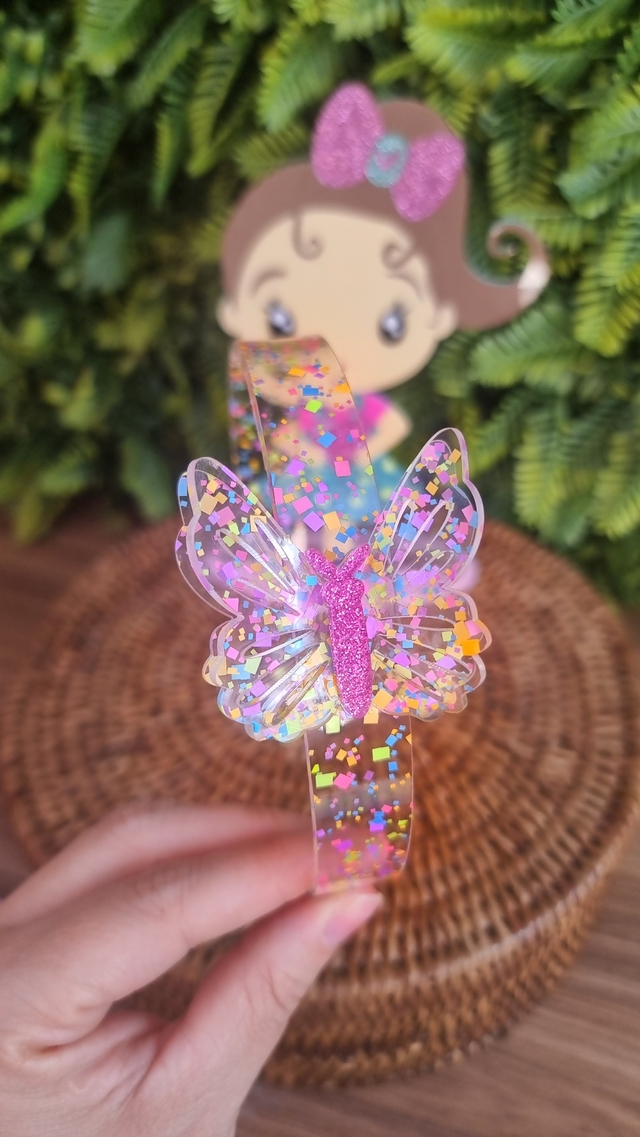 Tiara Borboleta transparente com detalhes coloridos que lembram confetes! A tiara fizemos da mesma cor e ficou incrível né? com detalhe de confete. Fizemos o detalhe do corpo da borboleta na cor furta cor. A borboleta feita em acrílico em duas camadas. Sendo a camada debaixo reta e a de cima vazada. Ela foi curvada para que as asas lembrassem uma borboleta voando. Ficou simplesmente perfeita né?